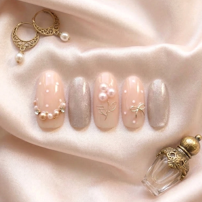 白のドット柄に可憐なパールのお花と小さなリボンを合わせた、